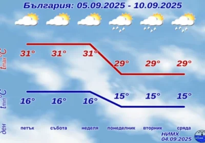 В петък и през почивните дни ще бъде предимно слънчево. Временни увеличения на облачността ще има над източните и планинските райони, но само на изолирани места ще превали краткотрайно. Ще духа слаб, в Източна България до умерен вятър от североизток. Максималните температури ще са между 29° и 34°.